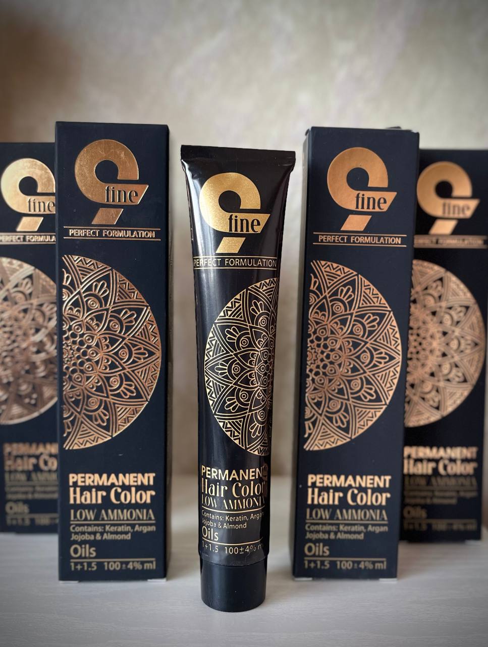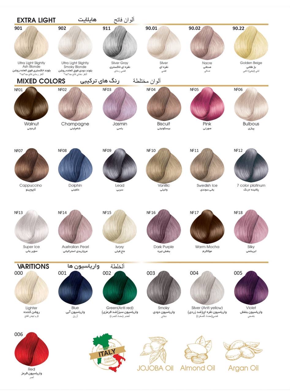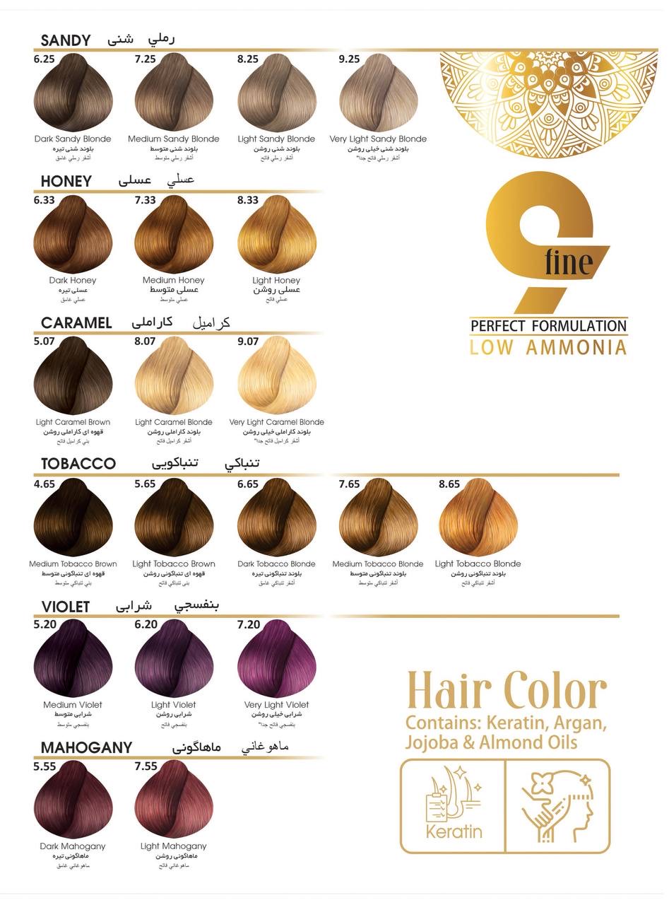 رنگ مو ناین فاین با آمونیاک بسیار پایین حاوی کراتین ، ویتامین C ، B5 و آلوئه ورا می باشد.فرموله شده با روغن های گندم ، کنجد ، زیتون ، جوجوبا ، آرگان و زیتون در کشور ایتالیا است.
